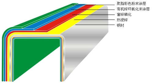 熱浸鋅:起到電化學保護作用,由內(nèi)到外防止鋼鐵基材的生銹。
